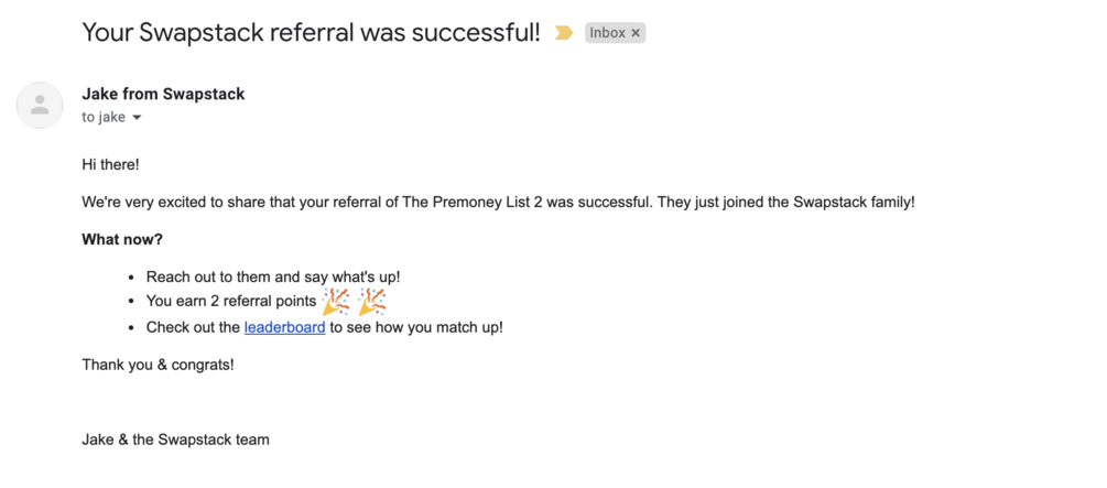 Overview: As part of building www.swapstack.co, we wanted to create a referral program that was flexible, easily changeable, specific to our needs (and free!). Using Zapier and Airtable, we built a program that allows our community to refer advertisers or writers (with different point values), track referral successes, and create a shareable leaderboard.